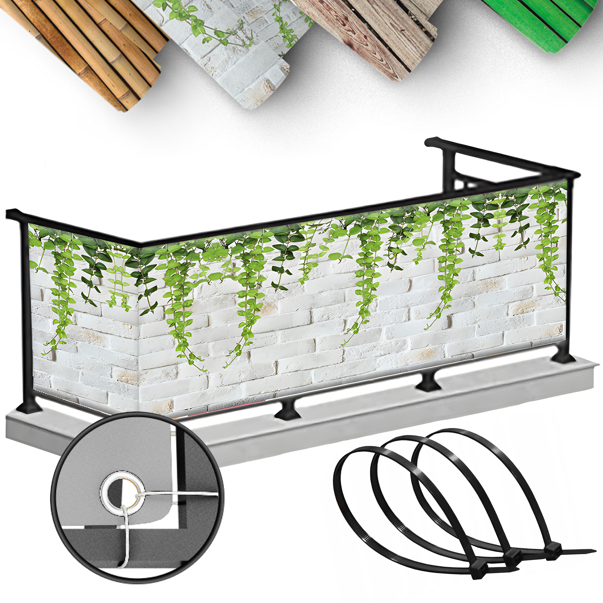 You can attach the balcony screen using cable ties or a fastening cord.