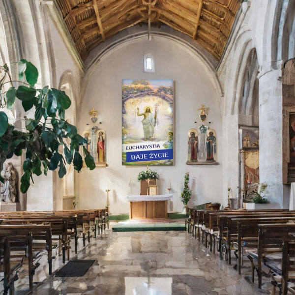 Our banner is not just a product, it is an expression of faith and respect for Christian tradition. With it, you can create a unique atmosphere in your surroundings or church, while expressing your deep convictions and participating in important liturgical moments. We offer images with the lamb, for Corpus Christi, Lent and Easter, for Holy Communion, Advent, depicting the cross of the Lord, Golgotha, the tomb of the Lord, backgrounds for the tomb of Jesus Christ, showing the death on the cross and the ascension.