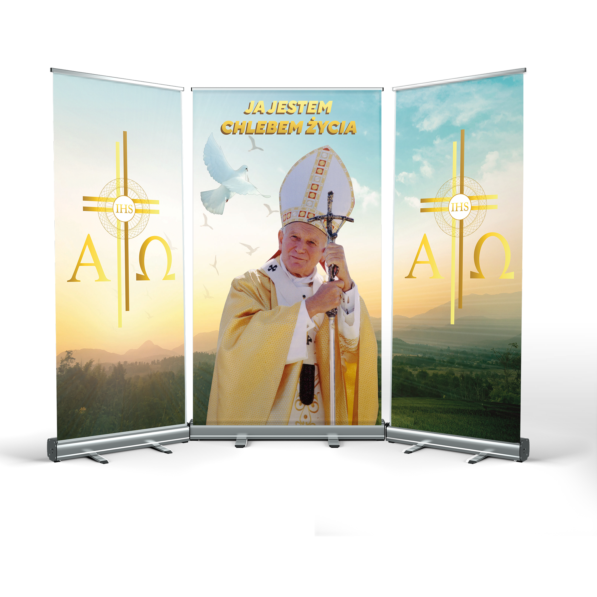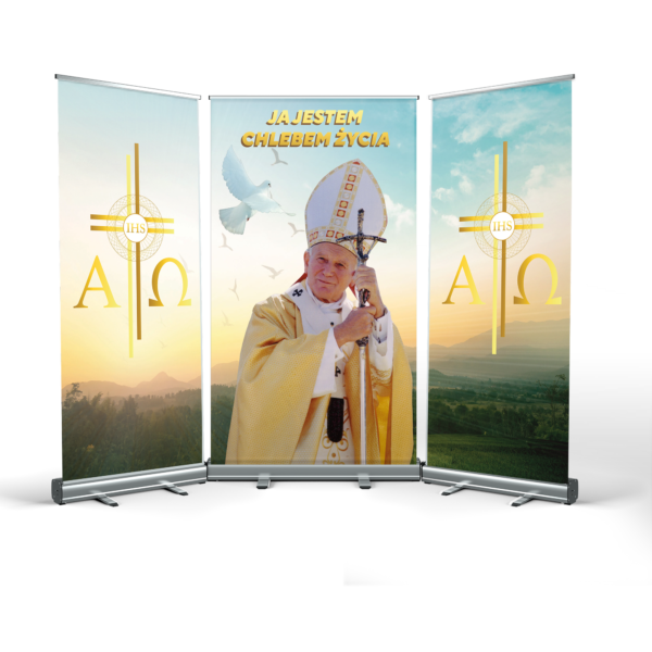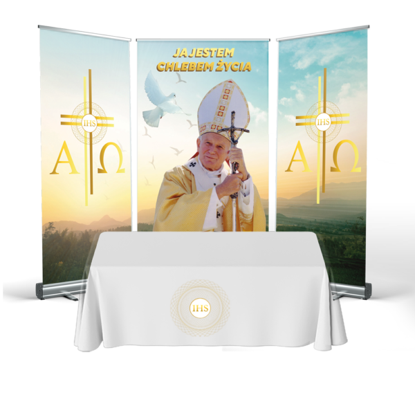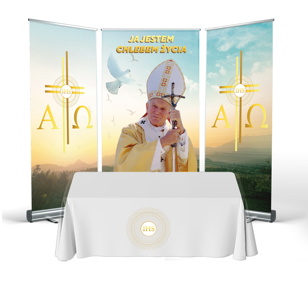 CORPUS CHRISTI ALTAR is a great idea for quickly arranging decorations in any location. The structure is made of durable cassettes, made entirely of anodised aluminium. The mast stabiliser guarantees a secure presentation of the print.
