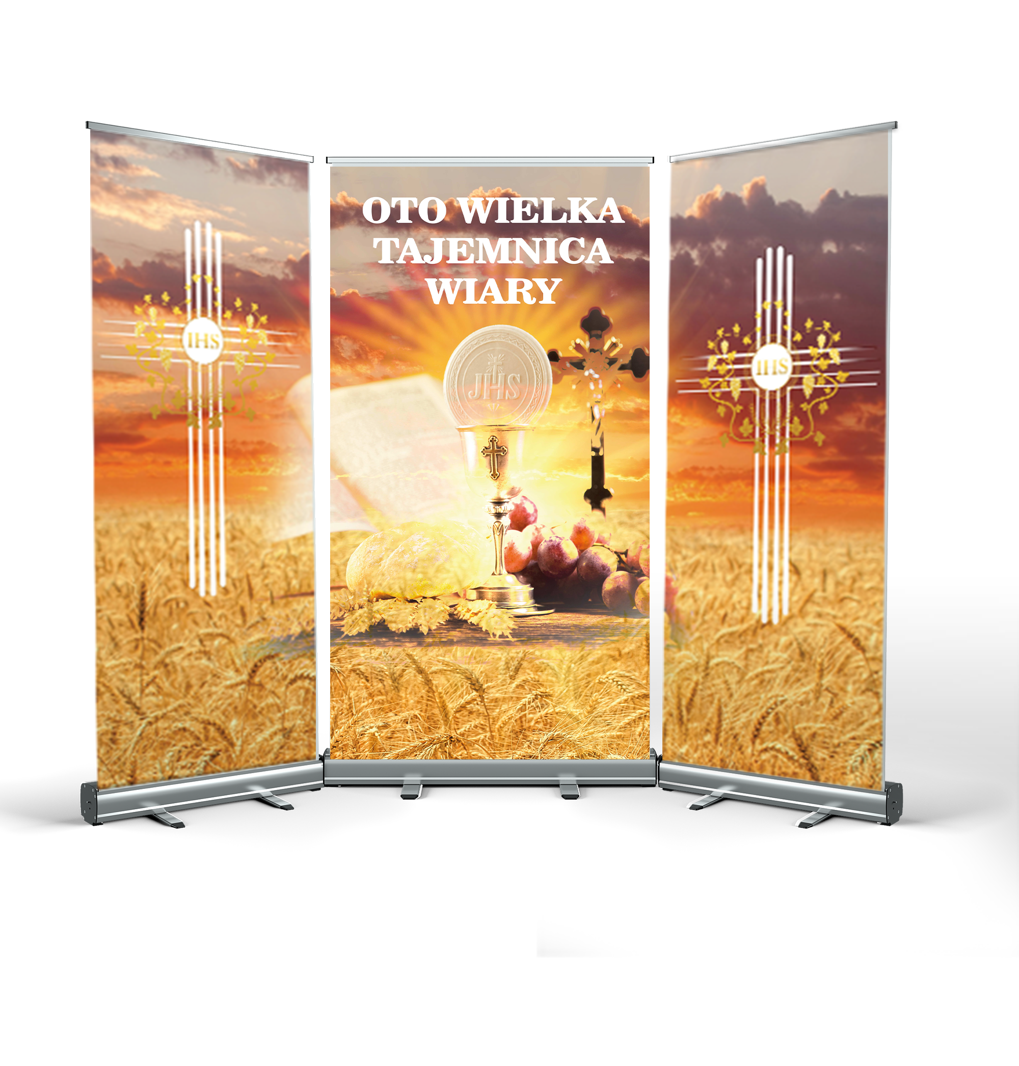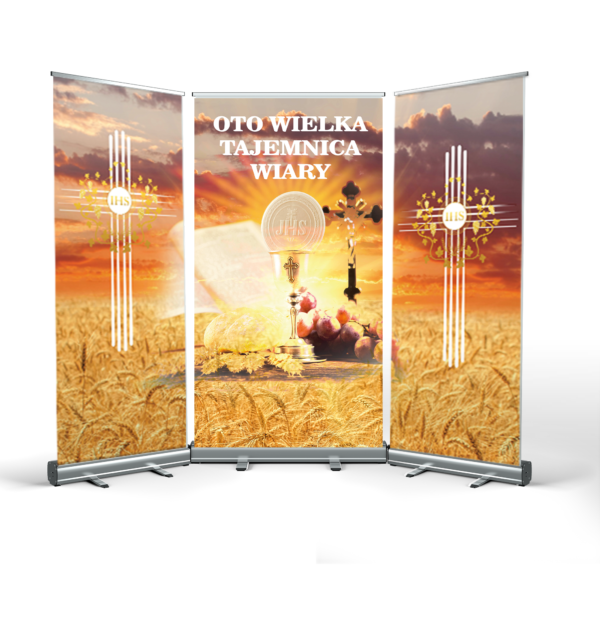 CORPUS CHRISTI ALTAR is a great idea for quickly arranging decorations in any location. The structure is made of durable cassettes, made entirely of anodised aluminium. The mast stabiliser guarantees a secure presentation of the print.