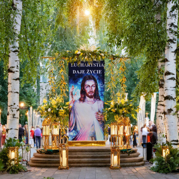 - Artistic image: The celebration of the Most Holy Body and Blood of Christ – the miracle of the transformation of consecrated bread and wine into the Body and Blood of Christ.