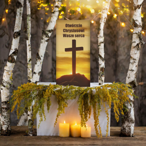 Our banner is not just a product, it is an expression of faith and respect for Christian tradition. With it, you can create a unique atmosphere in your surroundings or church, while expressing your deep convictions and participating in important liturgical moments. We offer images with the lamb, for Corpus Christi, Lent and Easter, for Holy Communion, Advent, depicting the cross of the Lord, Golgotha, the tomb of the Lord, backgrounds for the tomb of Jesus Christ, showing the death on the cross and the ascension.