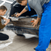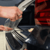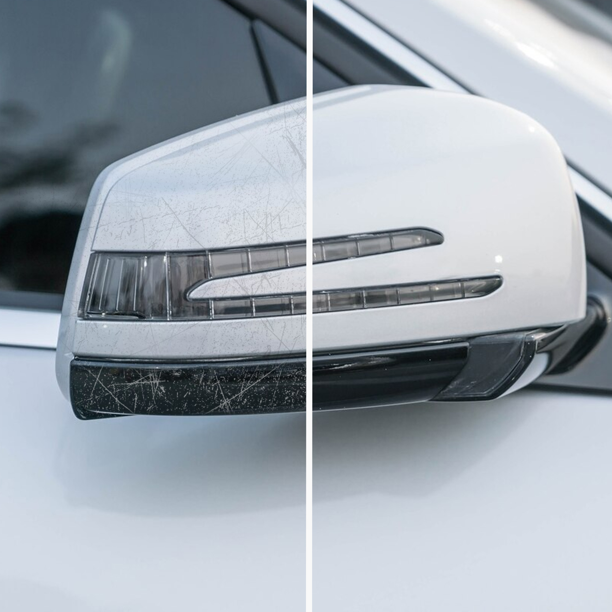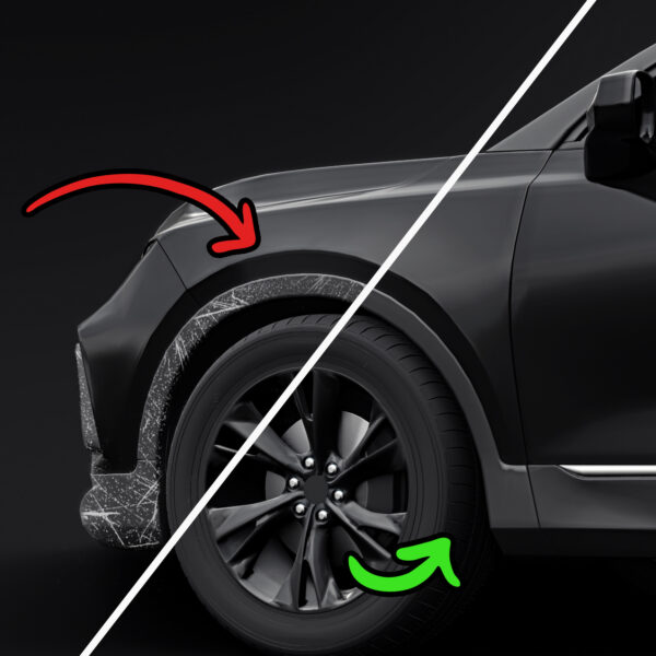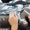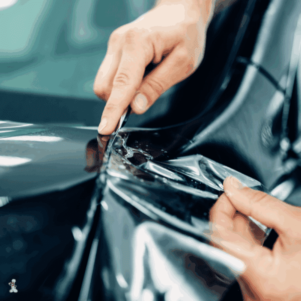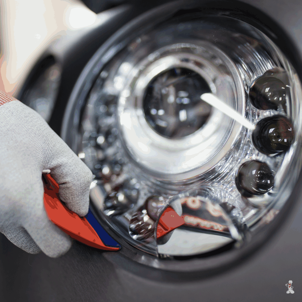 - After sticking the film, it should be trimmed (cut off any excess film). The photo shows an example of our work with a blade on glued film. Cutting film on paintwork or lights requires skill and experience, as there is a high risk of damaging the paintwork. The film should be cut and not sliced.