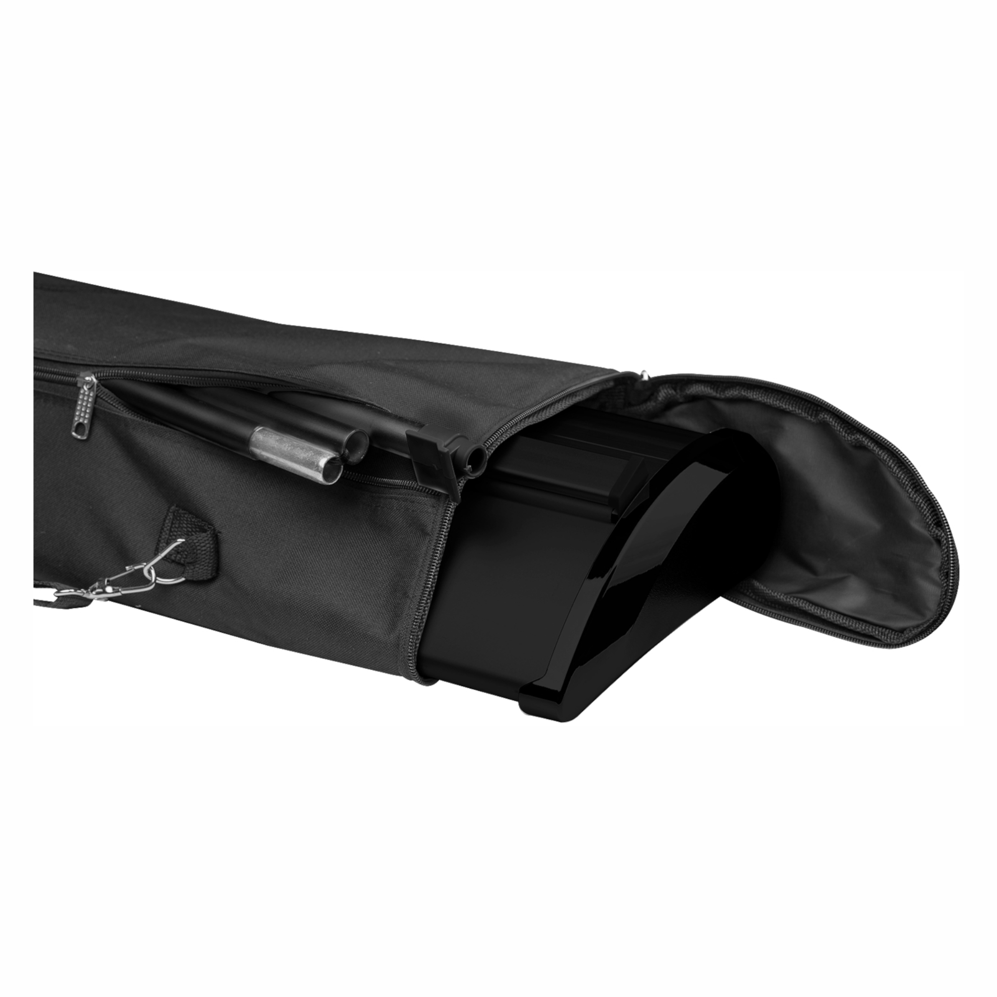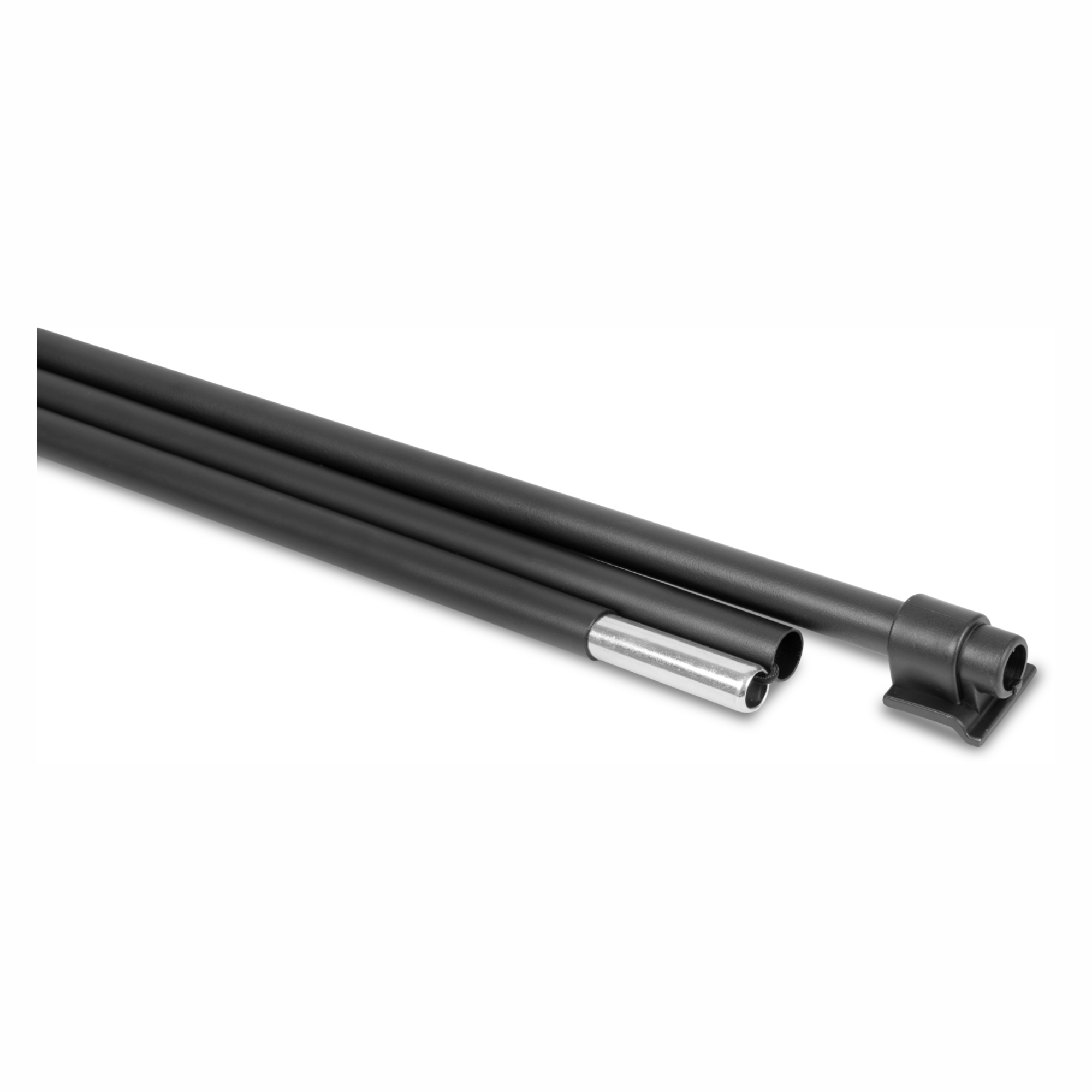 - Barre de fixation et mât à trois sections de type bungee de couleur noire.
