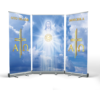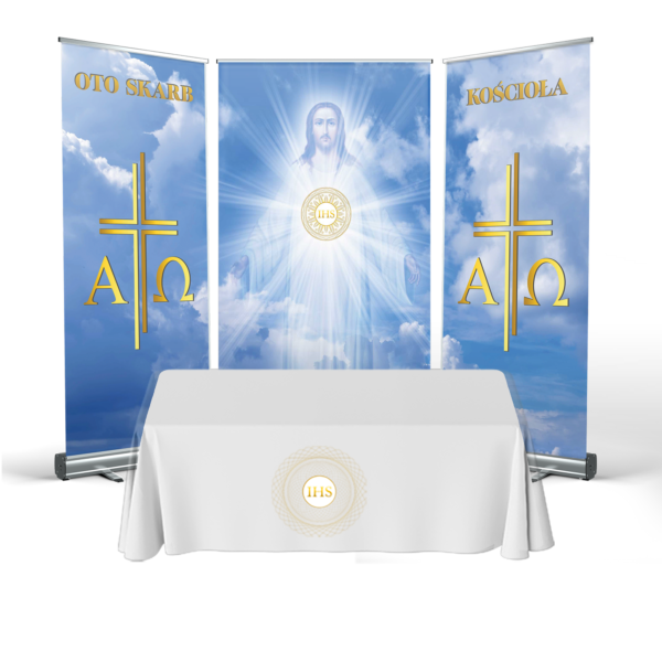 OŁTARZ NA BOŻE CIAŁO to doskonały pomysł na szybkie rozmieszczenie dekoracji w dowolnym miejscu. Konstrukcja wykonana jest z wytrzymałych kaset, wykonanych w całości z aluminium anodowanego. Stabilizator masztu gwarantuje pewną prezentację wydruku.